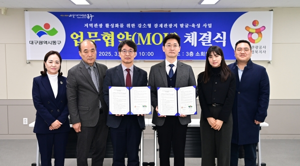 대구 동구청(구청장 윤석준)은 17일, 한국관광공사 대구경북지사와 업무협약을 체결하고, 공모를 통해 선정된 강소형 잠재 관광지인 옻골마을의 발굴・육성과 지역관광 활성화를 위해 힘을 모으기로 했다.