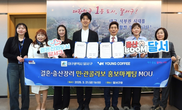 대구 달서구(구청장 이태훈)가 지난 21일 구청에서 전국 프랜차이즈 커피 브랜드인 ‘영커피’와 함께 결혼·출산장려 공동 홍보마케팅을 위한 업무협약(MOU)을 체결했다고 밝혔다.