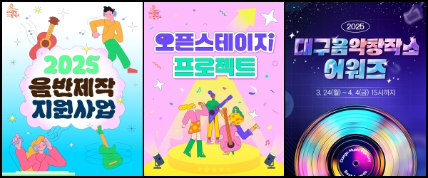 대구음악창작소 어워즈는 4월 4일, 음반제작 지원사업은 4월 11일까지, 오픈스테이지 프로젝트는 4월 18일까지 접수 가능하다. 보다 자세한 일정과 지원 내용 등은 대구음악창작소 홈페이지와 인스타그램 등을 통해 확인할 수 있다.