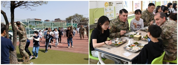 이어진 점심시간에는 장병들이 학생들과 함께 급식을 먹으며 일상적인 대화를 나눴다. 학생들은 같은 테이블의 미군들에게 당일 점심메뉴인 ‘시래깃국’을 미군에게 설명해주고, 미군들은 영어로 "What is your favorite food?"라며 말을 걸며 즐겁게 소통하는 모습을 보였다.