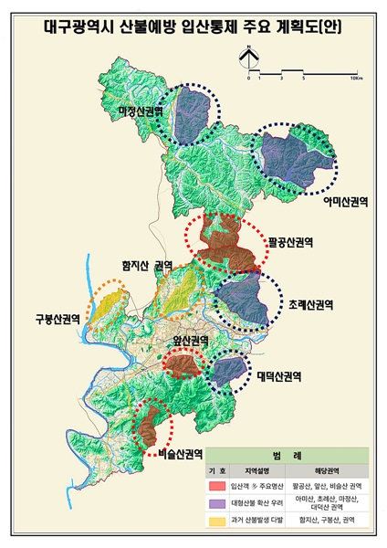 적용되는 구역은 △팔공산, 앞산, 비슬산 등 입산객이 많은 주요명산 구역 △아미산, 초례산, 마정산, 대덕산 등 산불발생 시 대형화 위험이 큰 구역 △함지산, 구봉산 등 과거 산불 발생 구역의 산림에 대하여 적용된다.
