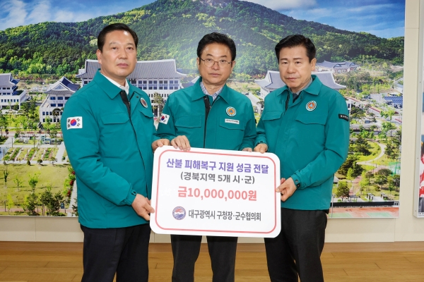 이번 성금은 최근 발생한 경북 안동, 청송, 영양, 영덕, 의성 등 주요 산불 피해 지역의 조속한 복구와 이재민 지원을 위해 대구시 9개 구청장·군수들이 뜻을 모아 마련했다.