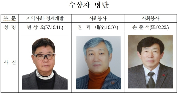 변상오 씨(지역사회‧경제개발 부문)는 자연보호중구협의회 회장, 남산4동 방위협의회 회장, 주민자치위원회 고문 등으로 활동하며 ▲신천변 수질정화, 수생식물 식재, 해안 쓰레기 정화 등 환경정화 활동과 ▲ 주민자치 특성화 프로그램 발굴 및 홍보 ▲ 교통질서 및 미소 친절 캠페인 등 시민의식 개선 활동에 앞장서 왔다. 또한 지속적인 봉사와 이웃돕기 후원 활동을 통해 쾌적하고 따뜻한 공동체 조성에 크게 이바지했다.