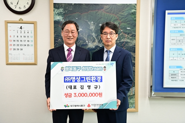 (주)명성그린환경(대표 김영규)은 16일, 구청을 방문해 어려운 이웃을 위해 사용해달라며 성금 300만원을 기탁했다.