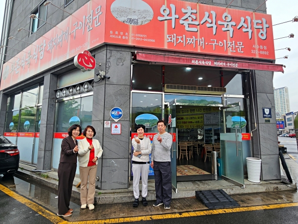 대구 북구 관문동 지역사회보장협의체(공동위원장 조혜정, 김귀남)는 지난 4월 22일(화) 대구사회복지공동모금회 착한대구 캠페인에 동참한 사수동 소재의 돼지찌개 전문점 와촌식육식당(대표 양정애)에 착한가게 현판을 전달하고 감사의 뜻을 전했다.