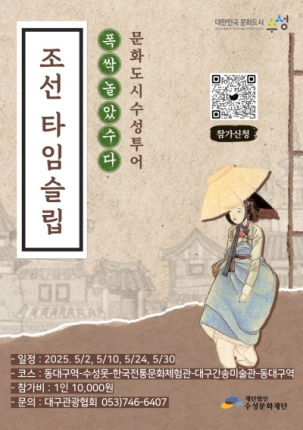 대구시 수성문화재단(이사장 김대권)은 가정의 달 5월을 맞아, 온 가족이 함께 즐길 수 있는 전통문화 테마투어 ‘폭싹 놀았수다. 조선 타임슬립’ 프로그램 참가자를 모집한다.