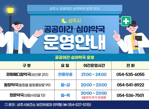 상주시보건소(소장 김주연)는 취약시간대 약국이용 불편 해소와 의약품 오남용 예방을 위해,‘공공야간·심야약국’3곳(경동메디칼약국, 함창약국, 정문약국)을 운영 중이다.