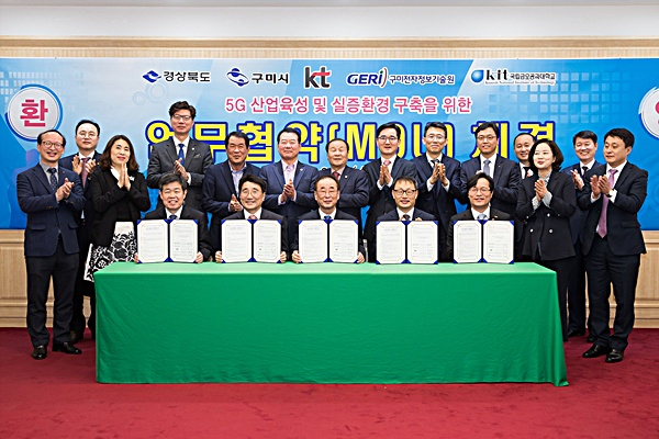 구미시(시장 장세용)와 경상북도(도지사 이철우)는 20일 시청 국제통상협력실에서 장세용 구미시장, 전우헌 경상북도 경제부지사, 구현모 ㈜KT 사장, 이상철 금오공과대학교 총장, 박효덕 구미전자정보기술원장 등 20여 명이 참석한 가운데 ‘5G 산업육성 및 실증환경 구축을 위한 업무협약식’을 가졌다.