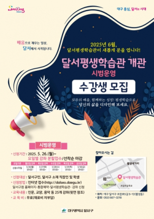 이태훈 달서구청장은 “달서평생학습관은 단순한 교육 공간을 넘어, 주민의 삶을 변화시키는 소통과 성장의 플랫폼이 될 것”이라며 “앞으로도 주민 수요에 기반한 맞춤형 프로그램을 확대해 누구나 배우고 나눌 수 있는 평생학습도시 달서구를 만들어가겠다”고 밝혔다.