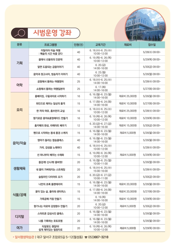 수강 신청은 5월 26일부터 달서구청 홈페이지에서 선착순으로 가능하다.