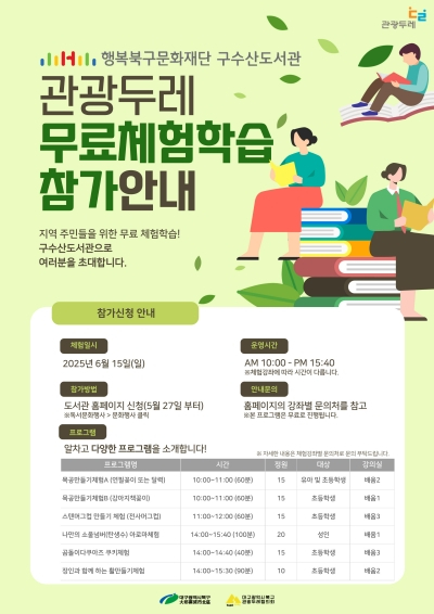 대구 북구청(청장 배광식)은 오는 6월 15일(일) 구수산도서관에서 북구 관광두레와 함께하는 주민참여형 체험 강좌를 운영한다고 밝혔다.