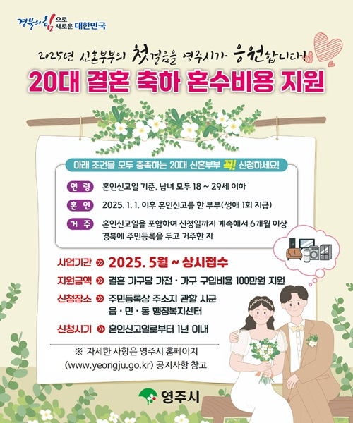 영주시는 결혼을 장려하고 청년층의 경제적 부담을 덜기 위해 오는 5월 26일부터 20대 신혼부부를 대상으로 “20대 결혼 축하 혼수비용 지원사업”을 본격 시행한다고 밝혔다.