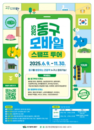 대구 동구청(구청장 윤석준)은 관광객 유치를 위해 6월부터 11월까지 비대면 관광서비스 ‘동구네 놀러가자! 모바일 스탬프 투어’를 실시한다.