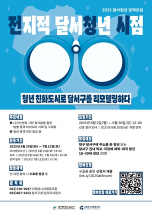 대구 달서구(구청장 이태훈)는 6월 20일까지, 지역 청년이 직접 정책을 발굴하고 제안하는 청년정책 포럼 「2025년 전지적 달서청년 시점」의 참여자를 모집한다.