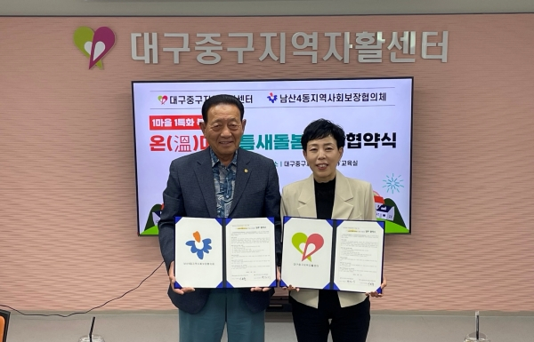 대구 중구 남산4동 지역사회보장협의체(위원장 이복출)는 지난 11일 대구중구지역자활센터 강당에서 대구중구지역자활센터(센터장 박영미)와 ‘ON(溫) 마을 틈새돌봄’ 협약(MOU)을 체결하고, 남산4동 맞춤형 돌봄 안전망 구축을 위한 협력 체계를 강화했다.
