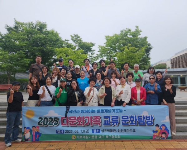 바르게살기운동 북구협의회(회장 박종현)는 6. 13.(금) 지역내 다문화가정(중국, 베트남 등) 및 바르게살기운동 회원 32명이 참석한 가운데 대구섬유박물관, 대구시민안전테마파크, 팔공산, 방짜유기 박물관 등을 답사하며 대구의 문화와 역사를 배우는 시간을 가졌다.