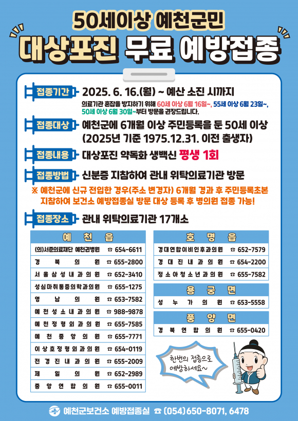 접종 대상은 예천군에 6개월 이상 주소를 둔 50세 이상 군민이며 대상포진 약독화 생백신 1회 접종을 지원한다.