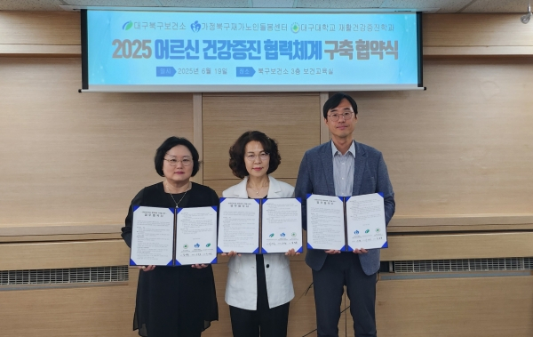 대구광역시 북구보건소(소장 이영숙)는 지난 6월 19일 가정북구재가노인돌봄센터, 대구대학교 재활건강증진학과와 함께 취약계층 어르신 건강관리를 위한 민·관·학 협력 기반 마련을 위한 3자 간 업무협약(MOU)을 체결했다.