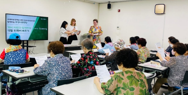 가브리엘 컨디 씨는 독일 카를스루에시 공무원 마렐 트랩토우 씨와 함께 매주 수요일과 금요일, 수성구 평생학습관에서 운영 중인 ‘수성이도학당’에 참여해 지역 어르신들과 소통하며 한국어를 배우는 시간을 가졌다. 이들은 각국의 언어로 기본 회화를 강의하며 문화와 언어를 상호 교류하는 의미 있는 시간도 가졌다.
