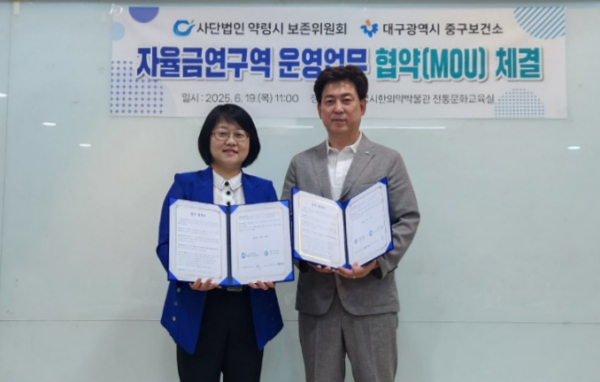 대구 중구보건소(소장 황석선)는 지난 6월 19일 사단법인 대구약령시보존위원회(이사장 이병식)와 주민의 간접흡연 피해를 예방하고 건강 증진을 도모하기 위한 ‘자율금연구역 운영 업무협약(MOU)’을 체결했다.