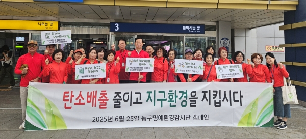 대구 동구 명예환경감시단(단장 이태원)은 지난 25일, 회원 30여 명과 함께 동대구역 광장에서 ‘탄소줄이기 환경보호 캠페인’을 진행했다.