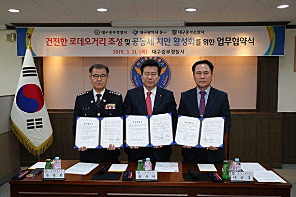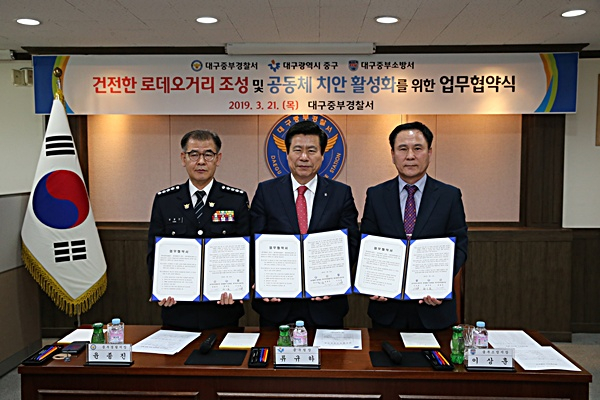 대구 중구(구청장 류규하)는 지난 21일 중부 경찰서에서 중부 경찰서(서장 윤종진)·중부 소방서(서장 이상훈)와 ‘건전한 로데오거리 조성 및 공동체 치안 활성화를 위한 업무협약’을 체결했다.
