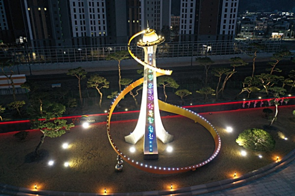 김천시장(김충섭 시장)은 시민 모두가 행복한 김천을 위한 염원과 시 승격 70주년을 기념하여 만남의 광장 조형물 야간경관조명을 지난 20일부터 점등했다고 밝혔다. 민선 7기 시정목표와 시정방침에 따라 만남의 광장 조형물 문구를 교체하고 다양한 야간 경관조명이 더해지면서 이색적인 분위기를 연출하고 있다.