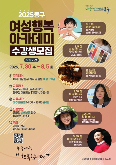 대구 동구청(구청장 윤석준)은 여성 역량 강화를 위한 ‘2025년 동구 여성행복아카데미’ 수강생을 30일부터 8월 5일까지 모집한다.