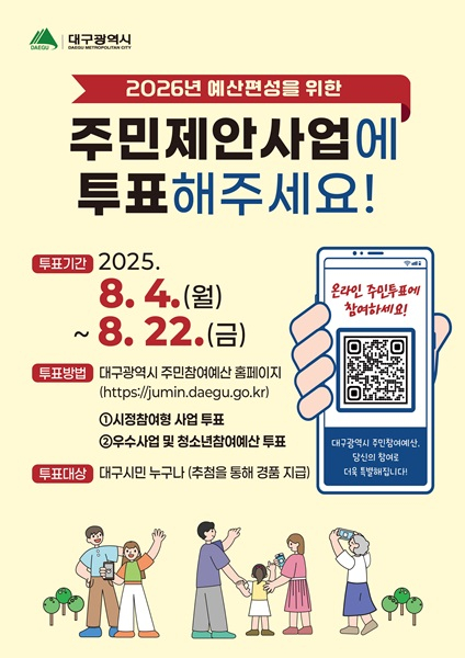 대구광역시는 2026년 주민참여예산사업 선정을 위해 8월 4일(월)부터 8월 22일(금)까지 3주간 온라인 시민 투표를 진행한다.