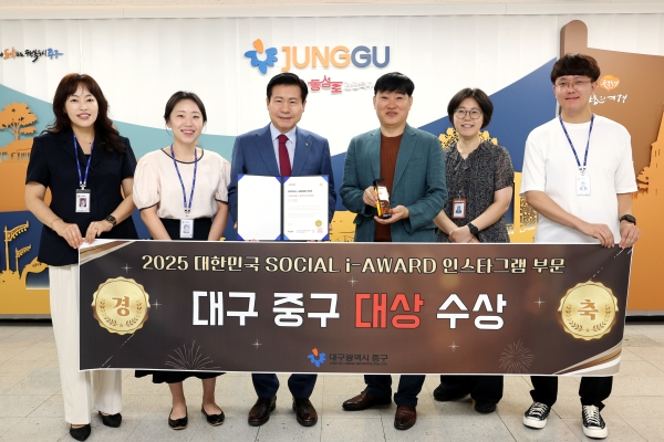 대구 중구(구청장 류규하)는 (사)한국인터넷전문가협회가 주최한 대한민국 소셜인터넷 서비스 혁신대상 시상식 ‘2025 소셜아이어워드(SOCIAL i-AWARD)’에서 지방자치단체 구(區) 분야 인스타그램 대상을 받았다고 밝혔다. 이는 지난해 최우수상에 이은 2년 연속 수상으로, 중구의 역량을 다시 한번 입증했다.