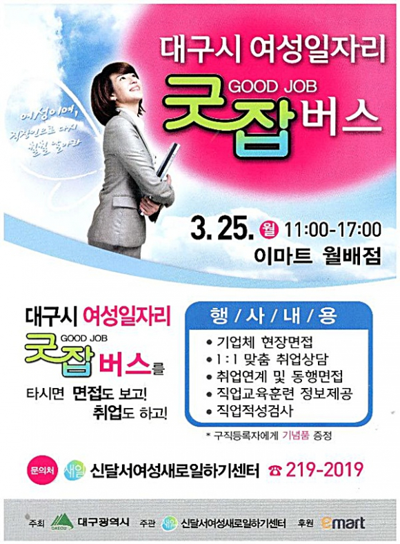 대구 달서구(구청장 이태훈)는 월배 지역 미취업 여성들을 위해 찾아가는 취업상담 및 기업체 현장면접을 제공하는 ‘굿 잡(good job)버스’를 25일 오전 11시부터 오후 5시까지 이마트 월배점(정문)에서 운영한다.