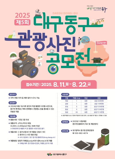 대구 동구청(구청장 윤석준)은 오는 22일까지 ‘제5회 대구 동구 관광 사진 공모전’ 작품을 접수 받는다.