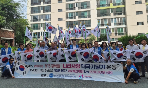 한국자유총연맹 대구수성구지회(회장 김인선)는 제80주년 광복절을 맞아 이달 11일부터 15일까지 ‘나라사랑 태극기 달기 운동’을 펼쳤다.