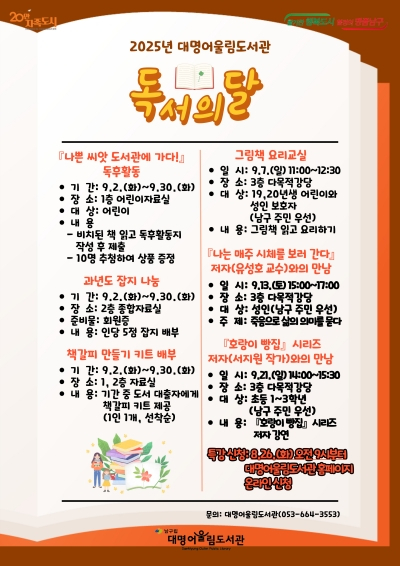 대명어울림도서관 독서의 달 행사와 관련된 사항은 대명어울림도서관 누리집 또는 SNS를 확인하거나 전화(☎664-3553)로 문의하면 된다.