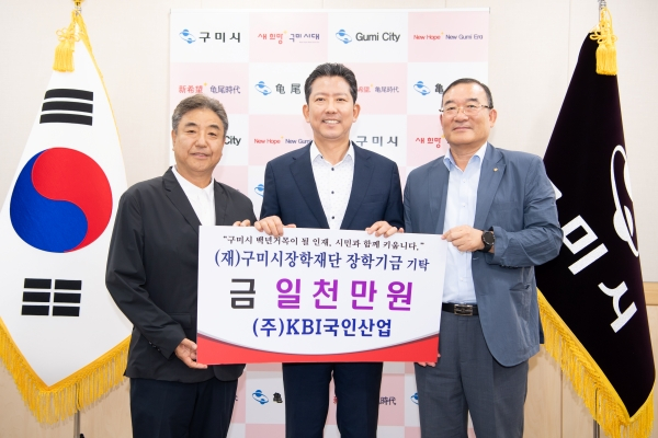 ㈜KBI국인산업(대표이사 시명권)에서는 지난 20일 구미시청 시장 집무실을 방문해 (재)구미시장학재단(이사장 김장호)에 지역인재육성 장학기금 1천만원을 기탁하였다.