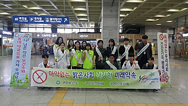이날 참가자들은 구미역 광장에서 불법 마약류 예방 및 폐의약품 회수 배너 설치, 홍보물 배부, 폐의약품 일정한 장소(약국, 보건소)에 배출 알리기, 마약류 위험성 알리기 등 찾아가는 홍보 캠페인을 전개했다.