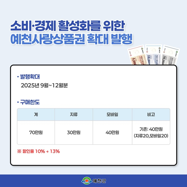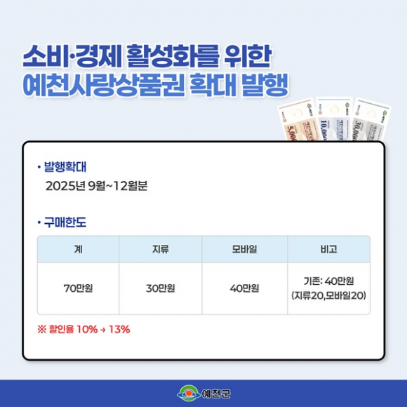 구매 한도와 혜택도 강화된다. 개인별 구매 상한을 기존 월 40만 원(지류 20만 원, 모바일 20만 원)에서 월 70만 원(지류 30만 원, 모바일 40만 원)으로 확대하고, 할인율도 10%에서 13%로 높여 군민들이 더 많은 혜택을 체감할 수 있도록 했다.