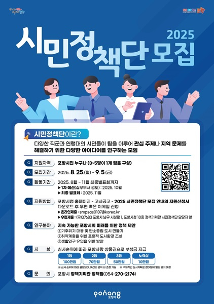지원 신청은 포항시 홈페이지에서 ‘2025 시민정책단’ 배너 또는 ‘고시공고-2025 시민정책단 모집 안내’를 통해 지원 신청서를 내려받아 우편 또는 이메일로 신청하면 된다.