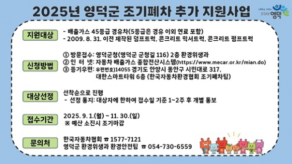 영덕군은 다음 달 1일부터 11월 30일까지 선착순으로 노후 경유차 조기 폐차에 대한 추가 지원사업을 시행한다.