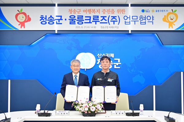 청송군(군수 윤경희)은 지난 27일 군청 미래도약실에서 울릉크루즈(주)와 협력과 상생 발전을 위한 업무협약(MOU)을 맺고, 군민들의 울릉도·독도 여행 활성화를 위한 다양한 지원 방안을 논의했다.