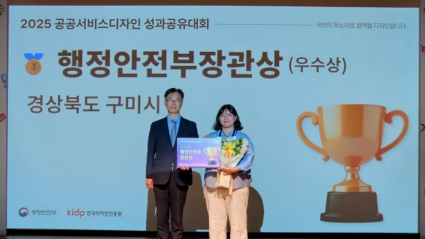 구미시가 9월 1일 정부세종청사에서 열린 행정안전부 주관 2025년 공공서비스디자인 성과공유대회에서 ‘시민정책디자인단’ 과제가 행정안전부장관상을 수상했다.