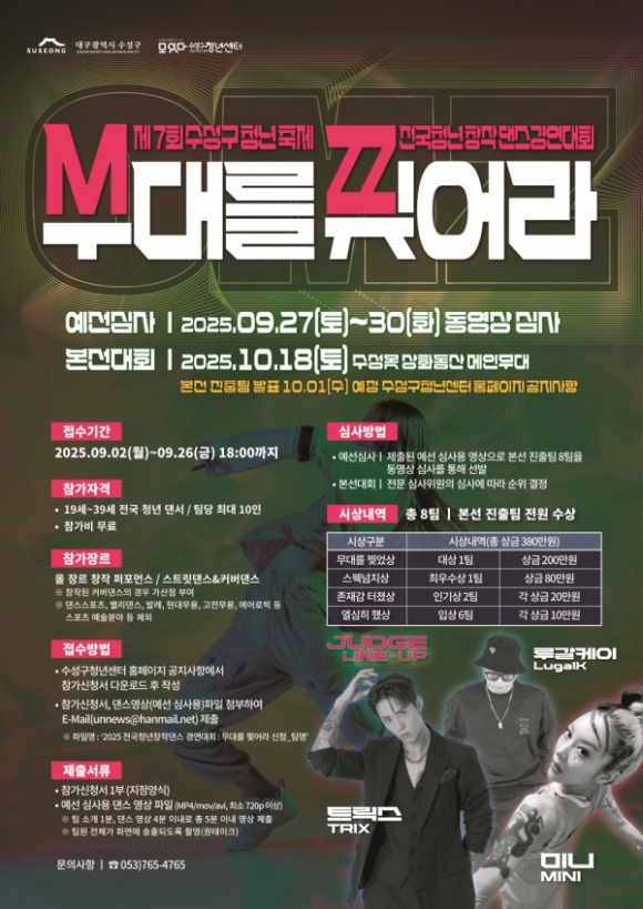 참가 신청은 오는 26일 오후 6시까지 참가 신청서와 예선 심사용 댄스 영상을 이메일(unnews@hanmail.net)로 제출하면 된다. 자세한 사항은 수성구청년센터 누리집(suseongyouth.or.kr)에서 확인할 수 있다.
