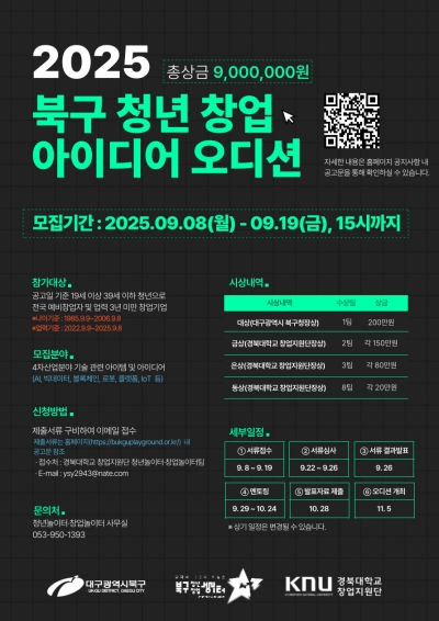 대구 북구청(청장 배광식)은 9월 8일(월)부터 19일(금)까지 전국 (예비)청년 창업자 등을 대상으로「2025 북구 청년 창업 아이디어 오디션」참가자를 모집한다.