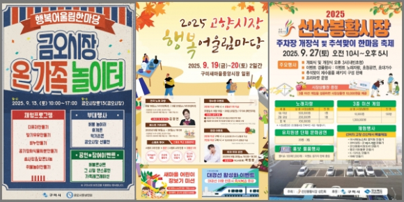 | ↑↑ 「2025년 고향시장 행복어울림마당」 포스터 - 금오시장(좌), 새마을중앙시장(가운데), 선산봉황시장(우) |