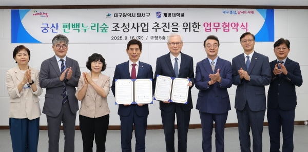 이태훈 달서구청장은 “협약을 통해 궁산 편백누리숲 조성사업이 속도감 있게 추진될 수 있도록 협조해 준 계명대학교에 감사드린다”며 “도시숲 조성을 지속 확대해 구민의 정주여건과 휴식의 품질을 높이겠다”고 말했다.