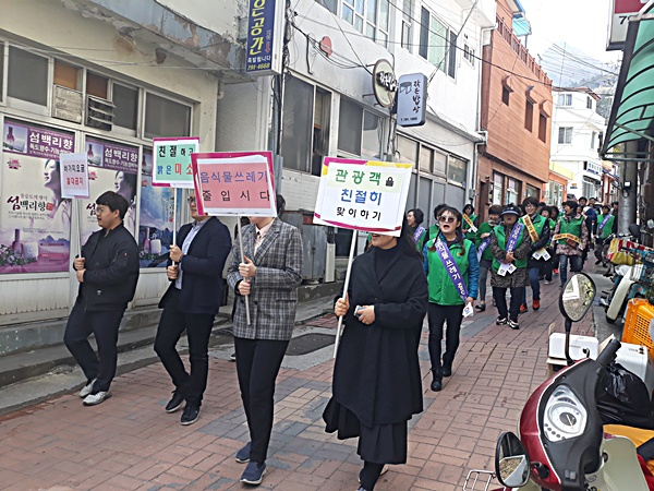 울릉군(군수 김병수)은 관광시즌을 맞이하여 관광객을 친절하고 안전하게 모시기 위하여 위생업소 밀집지역을 대상으로 손님맞이 친절향상을 위한 가두캠페인을 지난 25일 실시했다.