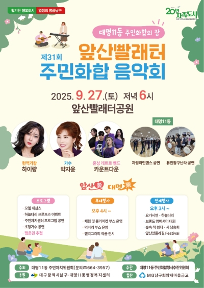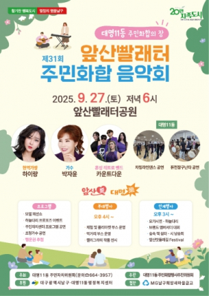 대구 남구 대명11동 행정복지센터(동장 이윤정)는 주민과 함께하는 문화축제로 오는 9월 27일(토) 오후 6시에 앞산빨래터공원에서 ‘제31회 앞산빨래터 주민화합 음악회’를 개최한다.
