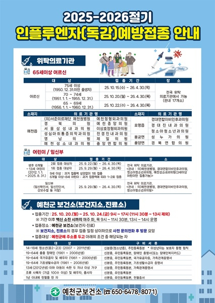 예천군은 군민 중 △14~18세 청소년(2007~2011년생) △19~64세 중증 장애인(1961~2006년생) △19~64세 국가유공자 및 배우자(1961~2006년생) △19~64세 기초생활수급자(1961~2011년생) △13세(2012년생) 이하 아동이 속한 두 자녀 이상 가구 △ 조류 사육자(가금 100수 이상) 및 배우자, 종사자를 대상으로 무료 접종을 시행한다.
