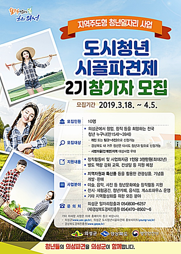 의성군(군수 김주수)은 외지 청년의 유입으로 청년일자리를 창출하고 지역경제를 활성화시키기 위해 ‘도시청년 시골파견제’사업의 2기 참가자를 모집한다.