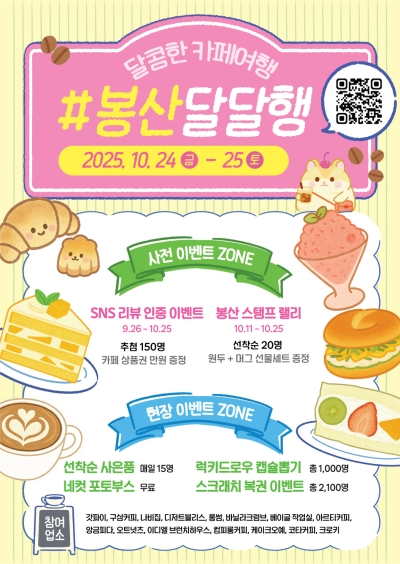 대구 중구(구청장 류규하)는 골목 상권 활성화를 위해 9월 26일부터 10월 25일까지 한 달간 사전 이벤트 ‘SNS 리뷰 인증 이벤트’를 시작으로 ‘2025년 달콤한 카페 여행, #봉산달달행’을 본격 추진한다.